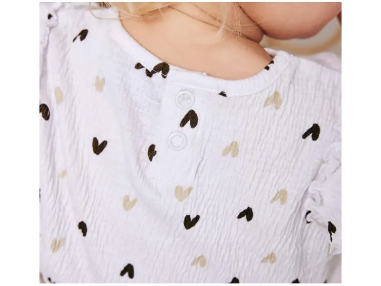 | Detail: | Volants aan de mouwen, zacht materiaal met kreukelstructuur, knooping in de nek en kruis voor gemakkelijk aan- en uittrekken |