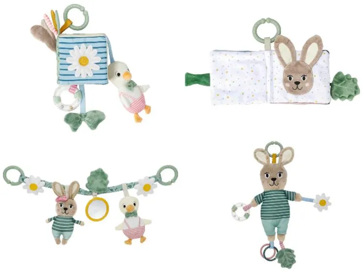 - Activiteitendier met rammelring, bel, knisperfolie, grijpringen en piepelement
