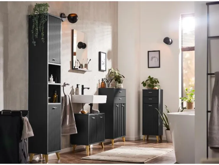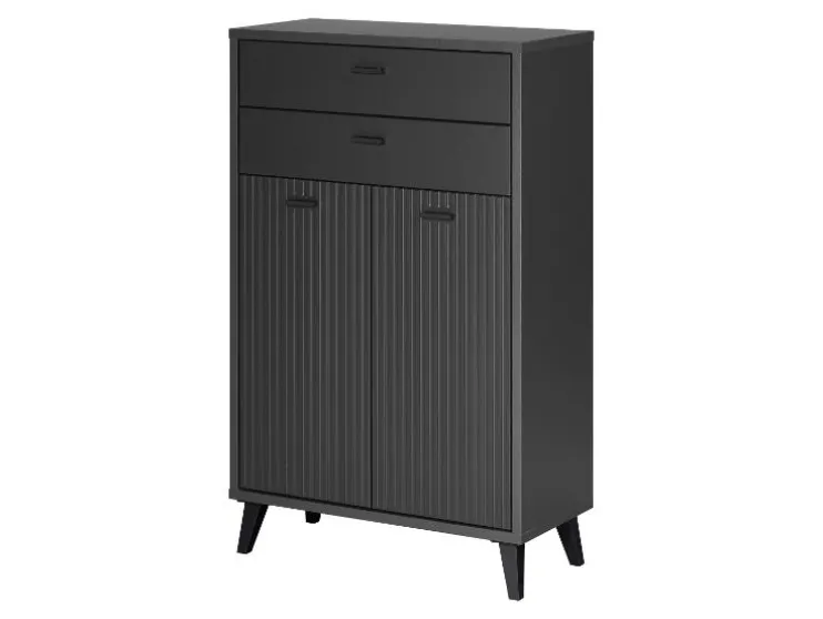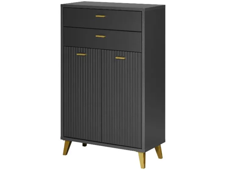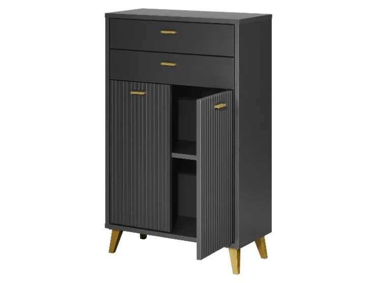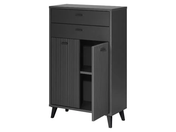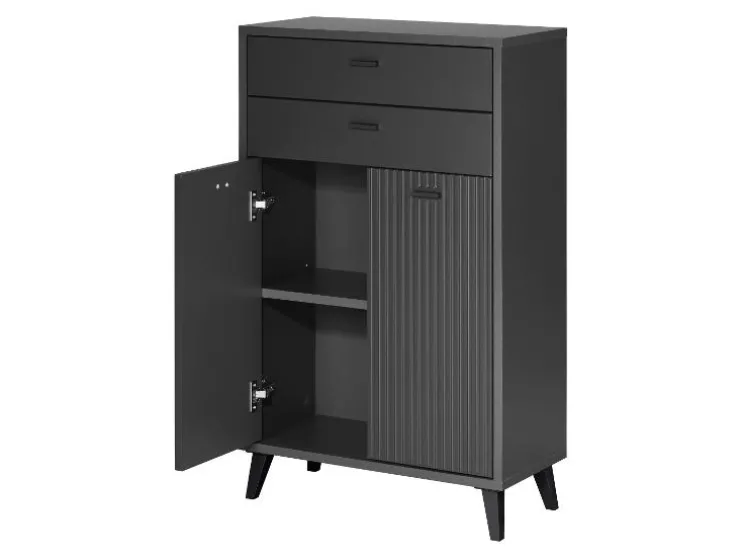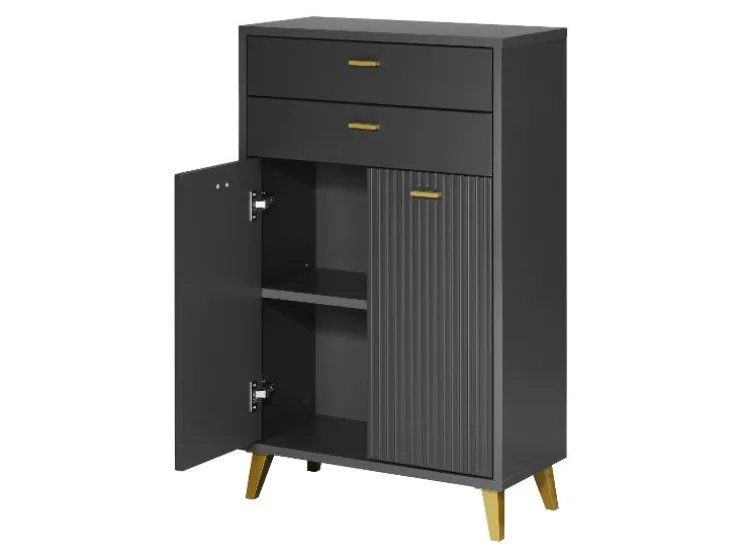 - Antracietkleurige uitvoering met 2 laden en 2 deuren met een gegolfde voorkant