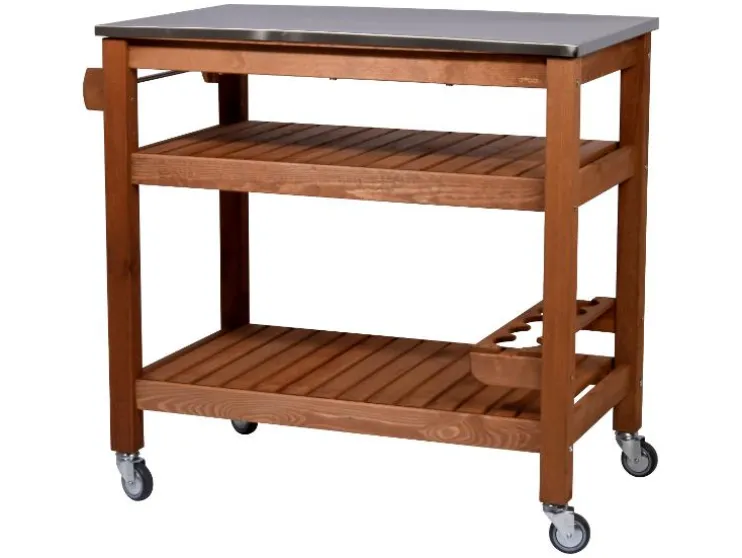 De verrijdbare bijzettafel heeft 4 robuuste wielen die met een rem kunnen worden vastgezet, en een handvat waarmee hij altijd gemakkelijk kan worden verplaatst. Op het onderhoudsvriendelijke roestvrijstalen blad kan naast dranken en buffetten ook een tafelgrill worden geplaatst. Voor de bijbehorende gasfles heeft de BBQ-wagen een ketting waarmee de fles direct onder de tafel kan worden vastgezet. Daarnaast bieden de twee uitneembare legplanken en vijf flessenhouders (Ø ca. 9 cm) voldoende opbergruimte onder het werkblad. De massieve serveerwagen is gemaakt van FSC®-gecertificeerd grenenhout (Pinus sylvestris, hoofdhouttype) uit duurzaam bosbeheer en is weerbestendig gelakt.
