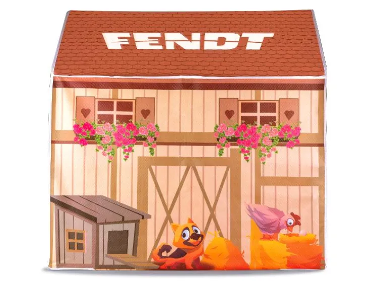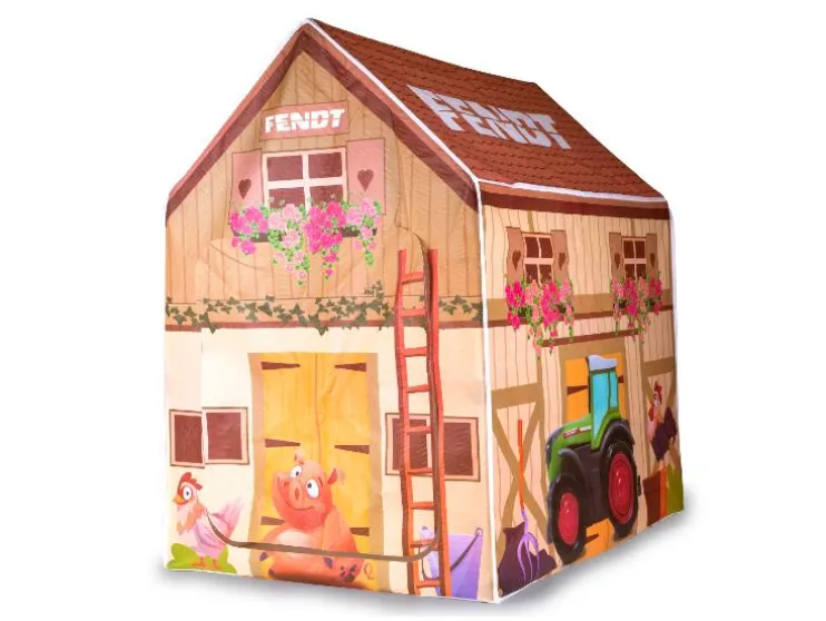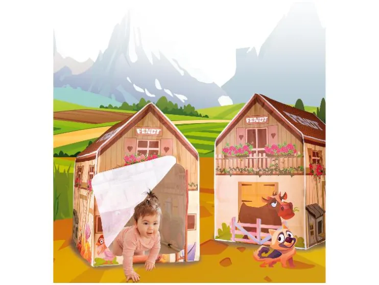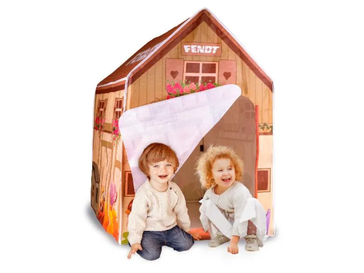 Het indoorhuis is ontworpen als een mooie boerderij en zal met zijn kleurrijke elementen, de Fendt-tractor en de grappige boerderijdieren kleine vriendjes enthousiasmeren. Door de open stoffen deur kunnen de kleintjes gemakkelijk in- en uitkruipen.