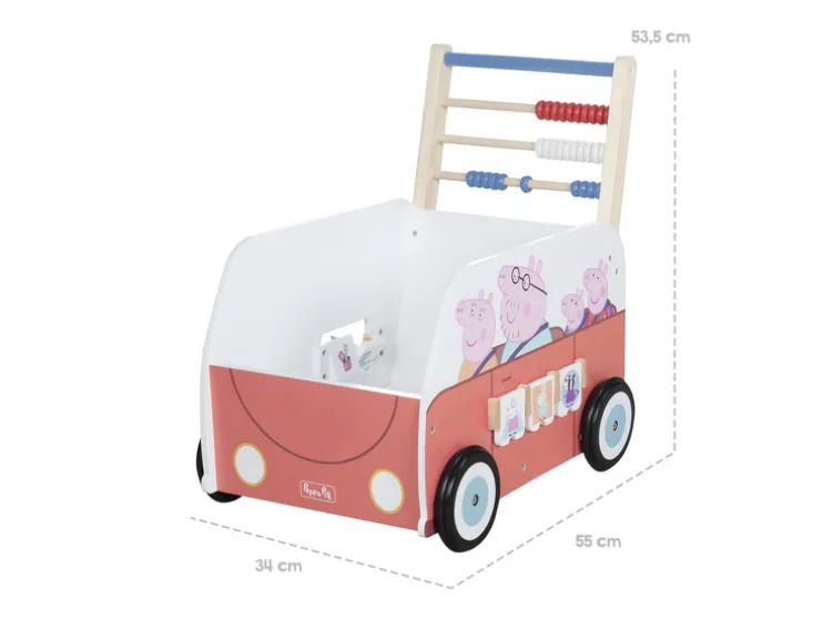 De roba duw- en motoriekbus is het perfecte speelgoed voor kleine fans van de populaire animatieserie Peppa Pig (Duits: Peppa Wutz). Met een kleurrijk motief en afbeeldingen van de serieheldin en haar familie is deze bus een echte blikvanger voor kinderen van alle leeftijden. De duwbus heeft verschillende spellen aan de zijkanten die voor veel afwisseling zorgen tijdens het spelen. Het handvat van de bus is ook een rekenliniaal in verschillende kleuren, wat helpt om de wiskundige vaardigheden van kinderen te ontwikkelen. Een klok op een van de zijkanten helpt kinderen om te leren klokkijken. Een draaispel zorgt voor vermaak en bevordert de motoriek. Op een andere pagina staan vouwplaatjes met cartoonmotieven die voor veel plezier zorgen tijdens het verkennen. Naast de verschillende speelmogelijkheden is de duwwagen ook een echt leerhulpmiddel. De rubberen wielen zijn vergrendelbaar en zorgen ervoor dat het kind de bus veilig en gemakkelijk kan duwen en sturen. Het handvat is ergonomisch gevormd en biedt het kind een stevige houvast. De duwbus helpt kleintjes leren lopen en ontwikkelt hun motorische vaardigheden. Een ander speciaal kenmerk van de duw- en motorbus van roba is de royale opbergruimte in de bus. Kinderen kunnen hun favoriete speelgoed en knuffeldieren meenemen en hebben altijd alles bij zich wat ze nodig hebben. De bus is ook ideaal voor kleine buitenavonturen of een bezoek aan vrienden en familie. Met een hoogte van 53,5 cm, een breedte van 55 cm en een diepte van 34 cm is de duwbus van roba ideaal speelgoed voor kinderen vanaf 12 maanden. Het is robuust en stabiel gebouwd om de uitdagingen van het dagelijkse spel te weerstaan. Al met al is de duw- en motorbus van roba geweldig speelgoed voor alle kleine fans van Peppa Pig. Met verschillende spelletjes en functies stimuleert het de motoriek, creativiteit en fantasie van kinderen. Tegelijkertijd is het een veilig en stabiel loophulpmiddel dat kinderen helpt hun eerste stapjes te zetten. De duwbus van roba is een geweldig cadeau voor elke gelegenheid en zal kinderen vele uren plezier geven.
