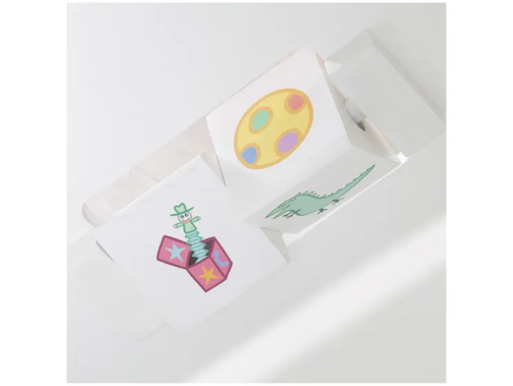 - Op een andere pagina staan vouwplaatjes met cartoonmotieven die voor veel plezier zorgen tijdens het verkennen