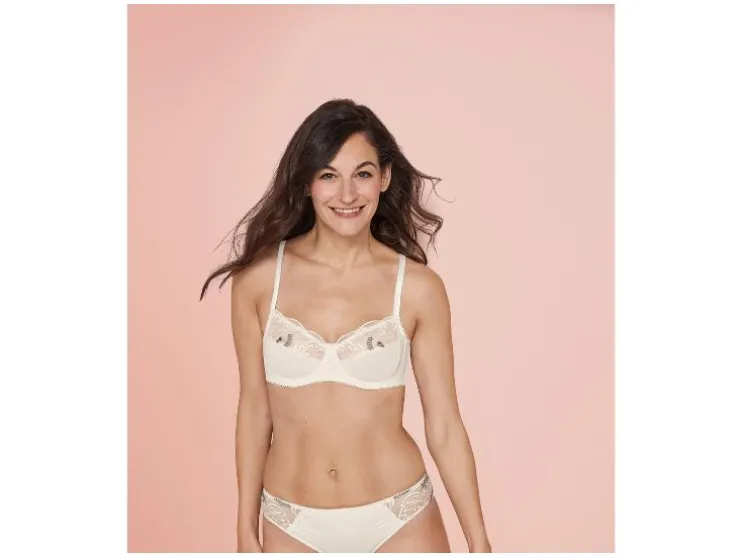 | Materiaal: | Breigoed: 86 % polyamide, 14 % elastaan (LYCRA®); Powernet: 88 % polyamide, 12 % elastaan (LYCRA®); Borduurwerkbasis/Charmeuse: 100 % polyamide; Borduurdraad: 100 % polyester |