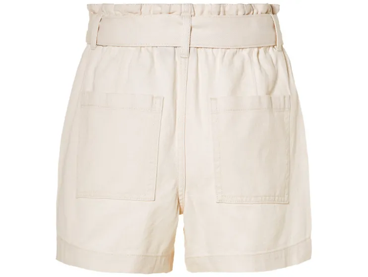 | Details: | Met decoratieve riem, hoge paperbag-tailleband, zijdelingse steekzakken |