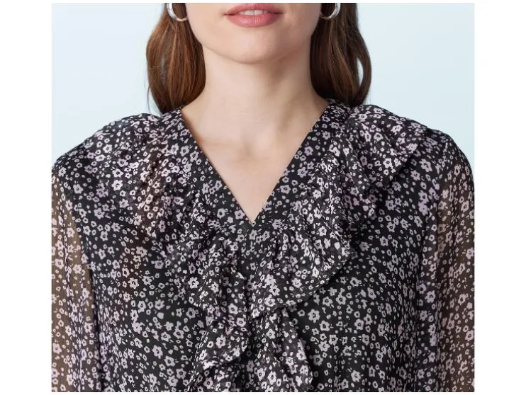 | Detail: | met speelse volants, in licht vloeiende chiffon kwaliteit, elastische tailleband, licht transparante mouwen met elastiek aan de uiteinden, ondoorzichtig gevoerd |
