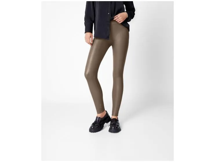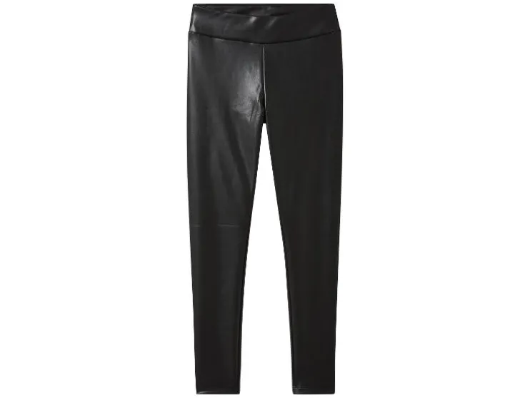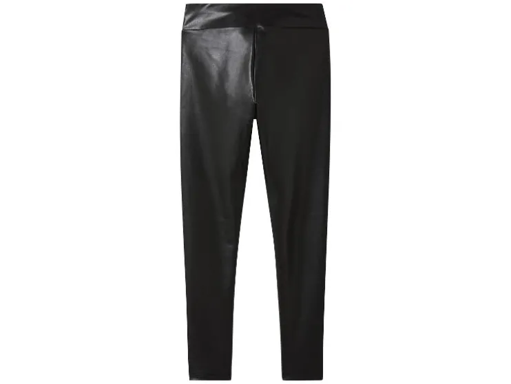 - Deze legging in leerlook heeft een brede tailleband en een normale taillehoogte