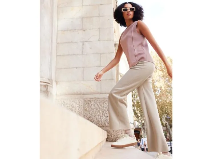 - Beige, zwart: normale taillehoogte met wijde, rechte pijpen