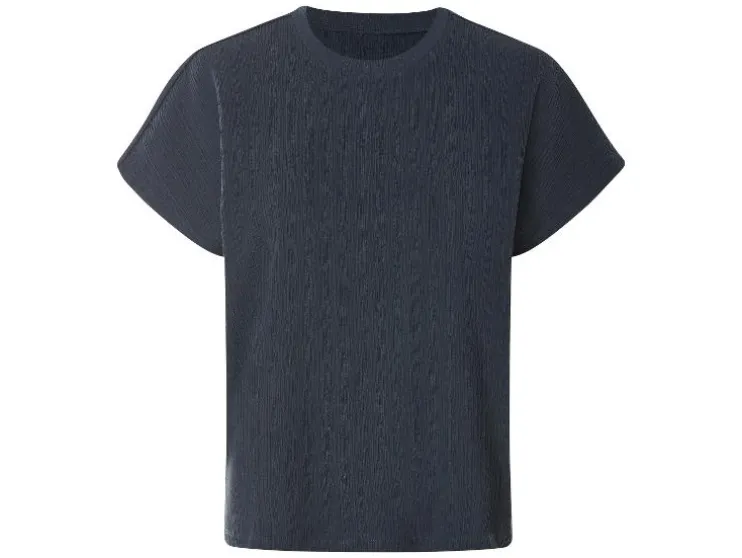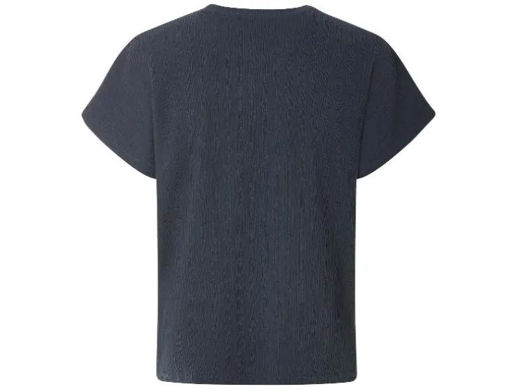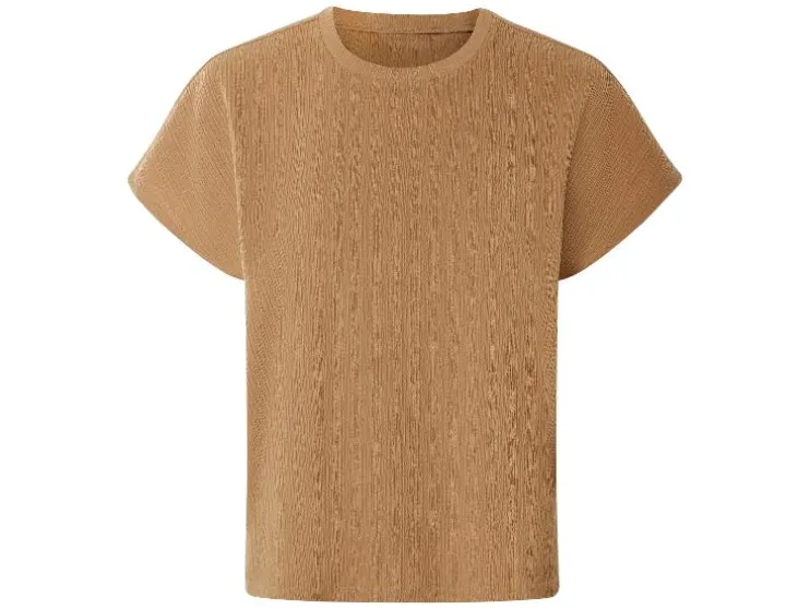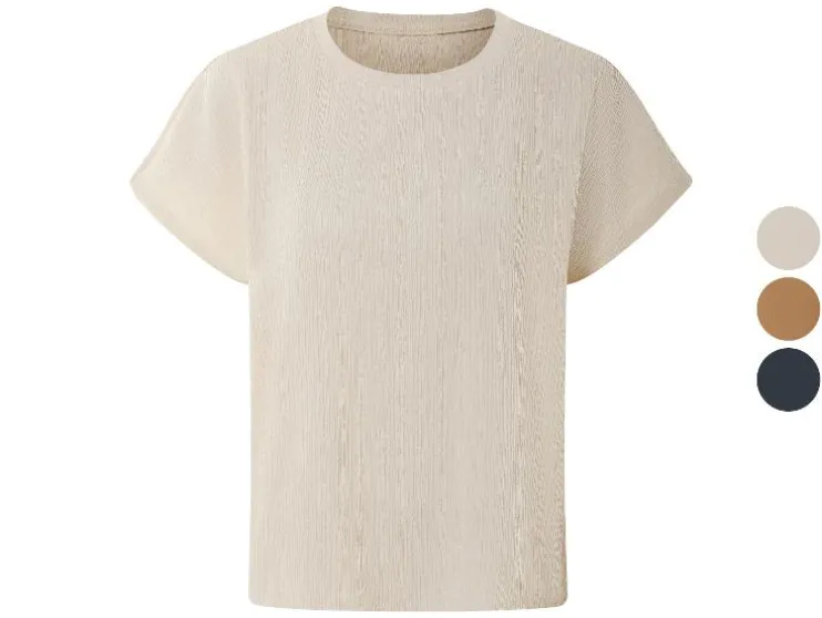 - Camel, marineblauw: casual met overgeslagen schouders en ronde hals