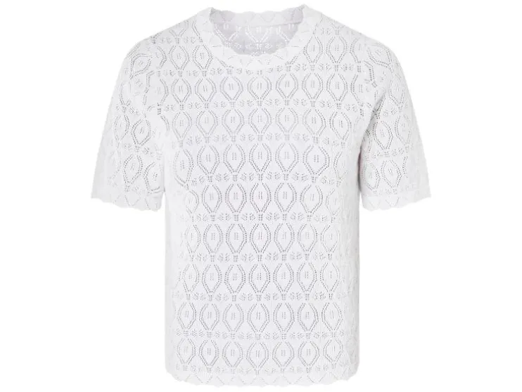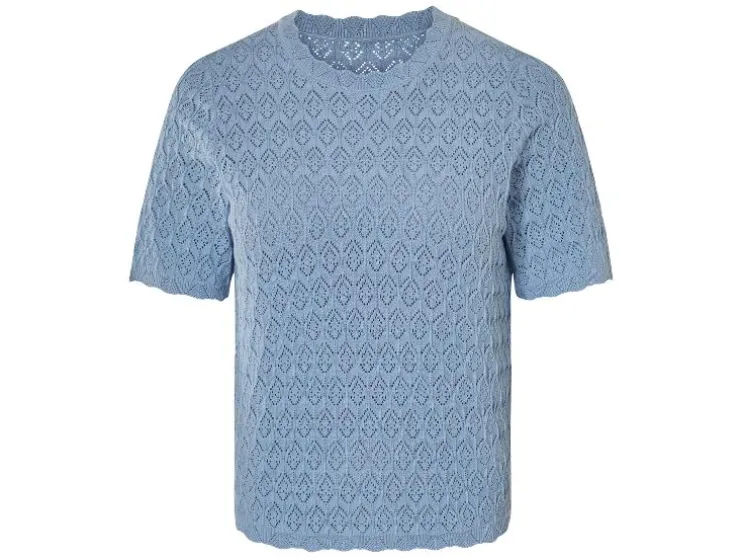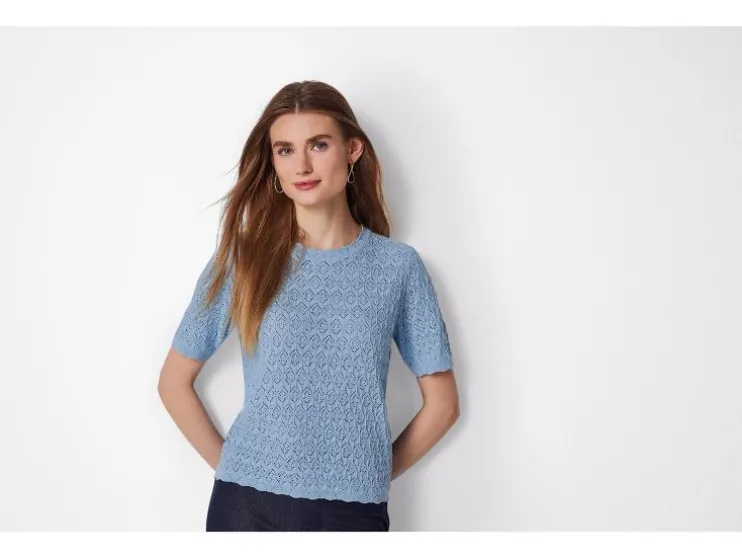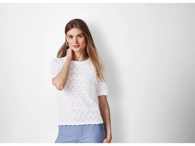 | Detail: | Golfrand aan hals, mouwen en zoom, licht transparant, driekwartmouwen |