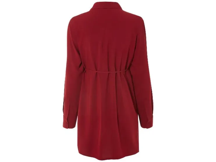 | Detail: | doorlopende knoopsluiting, afneembaar strikband in de taille, knoopsluiting aan de mouw, verlengde voorkant met afgeronde zoom |