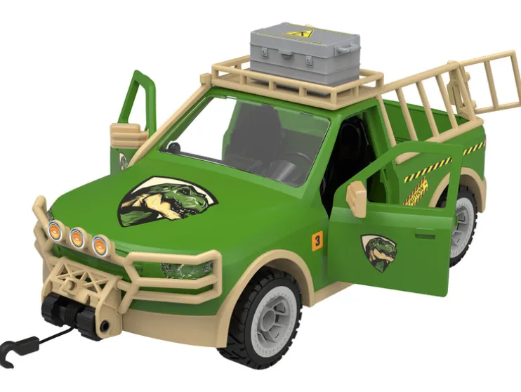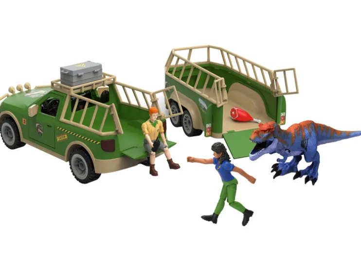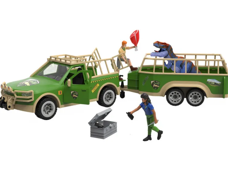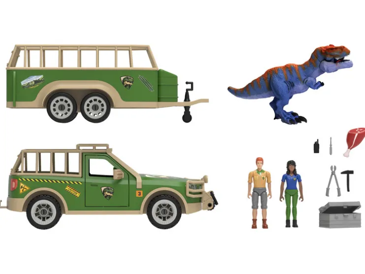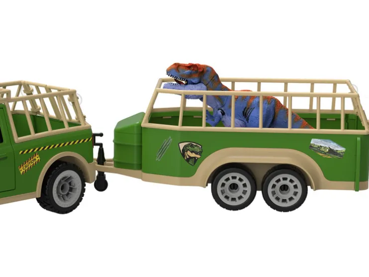 - Inhoud: pick-up, aanhanger, 2 speelgoedfiguren, T-Rex dinosaurus, vleespoot, reparatiedoos, schroevendraaier, hamer, tang, radio