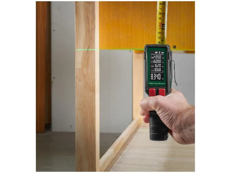 Maak meten eenvoudig en betrouwbaar met dit digitale meetgereedschap of rolmaat. Perfect voor zagen, aftekenen en nauwkeurige afstandsmetingen.