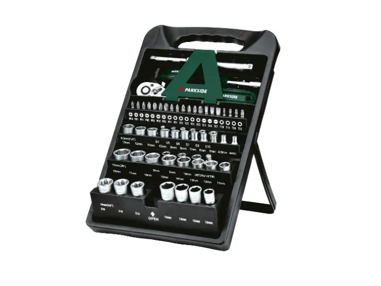 | Inhoud: | 3x E-profiel dopsleutel, ca. Ø 10 mm (3/8″), 11x dopsleutel, ca. Ø 10 mm (3/8″), 11x dopsleutel, ca. Ø 6,3 mm (1/4″), 1x ratel (72 tanden), ca. Ø 10 mm (3/8″), 1x schroevendraaierhandvat, ca. Ø 6,3 mm (1/4″) – ook te gebruiken als verlengstuk, 2x verlengstuk, ca. L 75 mm à Ø 10 mm (3/8″) en Ø 6,3 mm (1/4″), 1x bit-adapter, ca. Ø 6,3 mm (1/4″), 20x bit, ca. L 25 mm, 6x E-profiel, ca. Ø 6,3 mm (1/4″), 1x adapter van, ca. Ø 10 mm (3/8″) naar Ø 6,3 mm (1/4″), 4x diepe dop, ca. Ø 10 mm (3/8″) – maten ca. Ø 10 / Ø 12 / Ø 14 / Ø 15 mm |