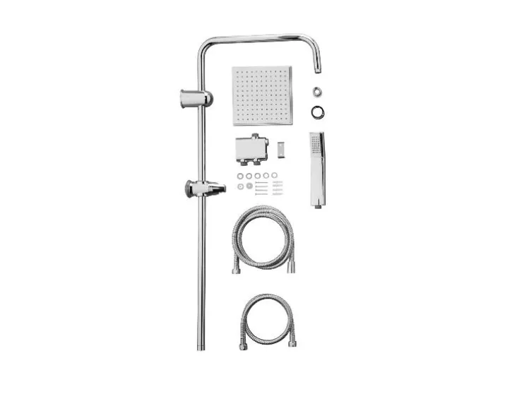 - Toebehoren: pluggen (ca. Ø 6 mm), handdouche, waterbesparende afdichting, afdichting, doucheslang handdouche (ca. 150 cm), doucheslang kraan (ca. 80 cm), omschakelaar, afdekdop (voorgemonteerd), kunststofschroef (voorgemonteerd), schroef, bevestigingselement, handdouchehouder, hoofddouche met voorgemonteerde afdichting, douchestraal, wandbevestiging, afdekking