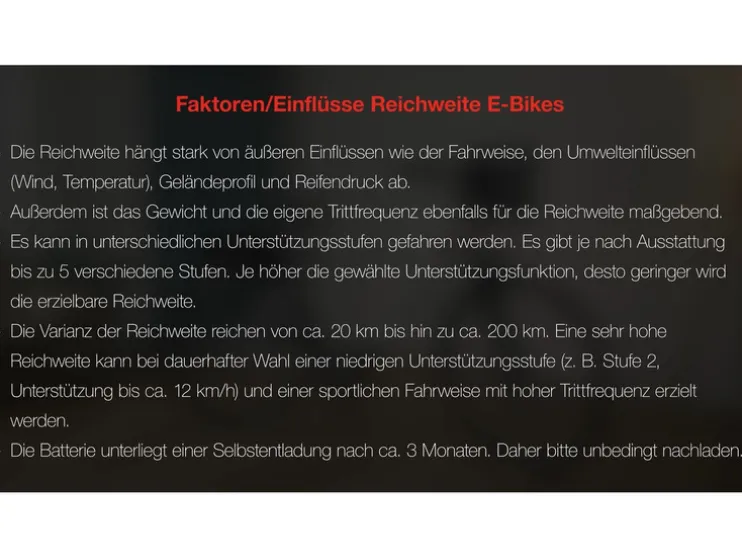 I Een accu werkt het meest efficient bij een temperatuurbereik van 10°C-25°. Bij buitentemperaturen onder de 10°C daalt het bereik door capaciteitsverlies. Dit ligt puur aan de technische opbouw van de ion-accu’s. De accu krijgt bij warmere temperaturen echter zijn oorspronkelijke capaciteit weer terug. Het maximale bereik wordt bovendien beïnvloed door factoren zoals het gewicht van de bestuurder, tegenwind, hellingen, bandenspanning of onregelmatig rijgedrag.