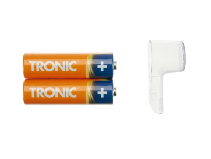 | Leveringsomvang: | 1x tandenborstel, 1x opzetborstel, 1x beschermkap voor opzetborstel, 2 x 1,5V AA batterijen |