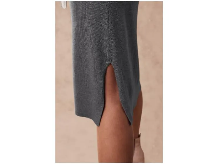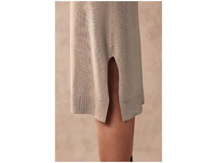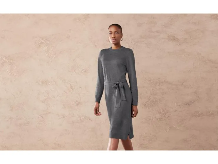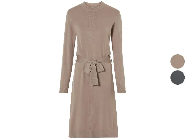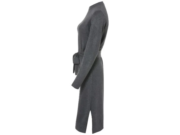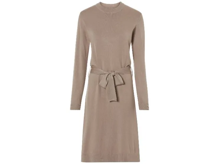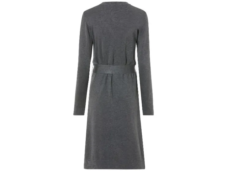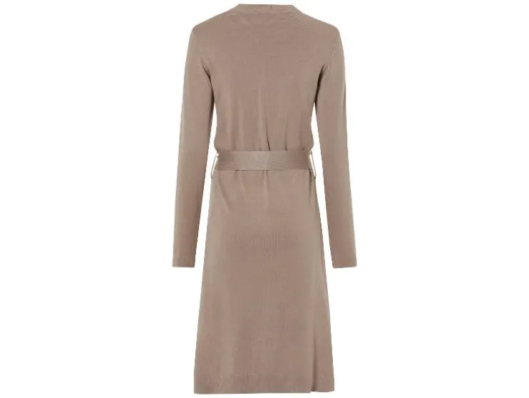 | Detail: | zachte, fijne gebreide kwaliteit, boordjes aan mouw- en zoom afwerking, brede ceintuur in de taille en zijsplitten |