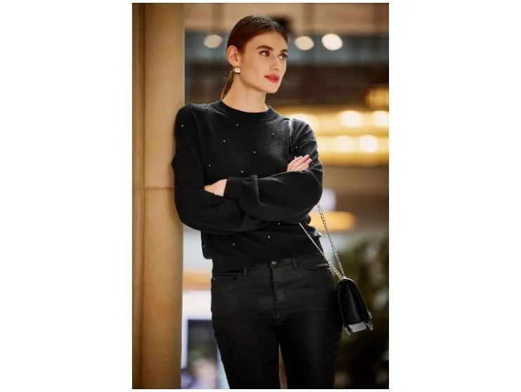 - Van zachte breikwaliteit met opgezette zilverkleurige parels