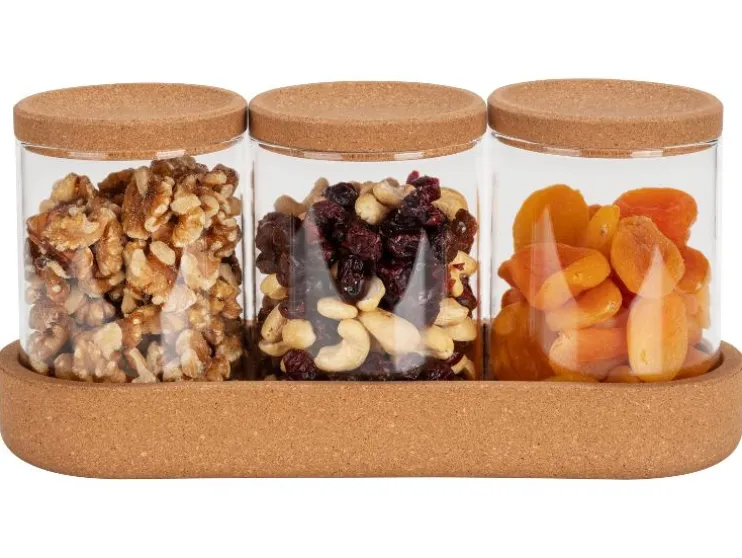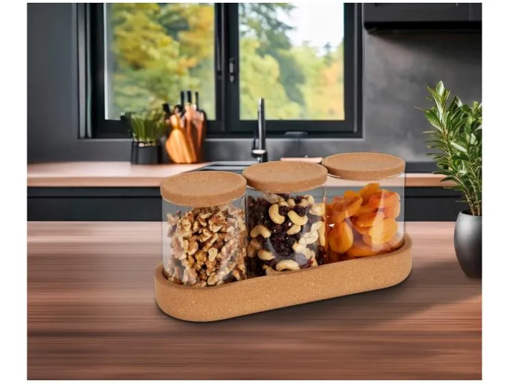 - 4-delige set opbergpotten met kurken deksel en dienblad