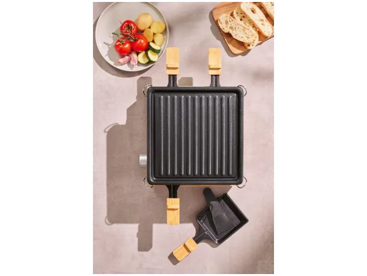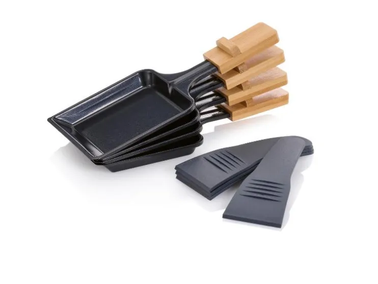 - Raclettepannetjes met antiaanbaklaag en afgeschuinde rand voor het gemakkelijk uitschuiven van gerechten
