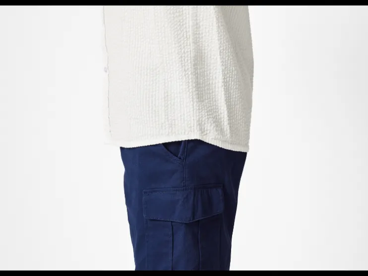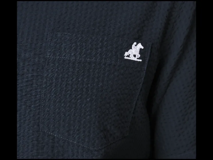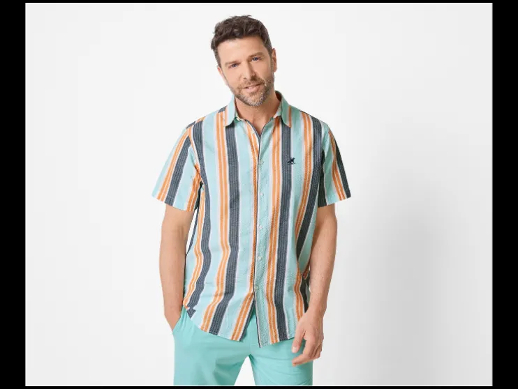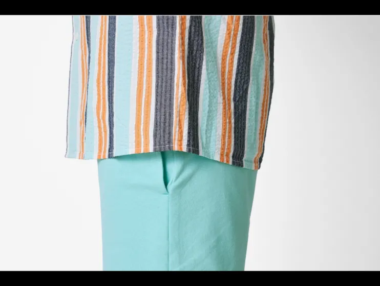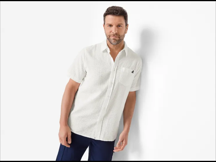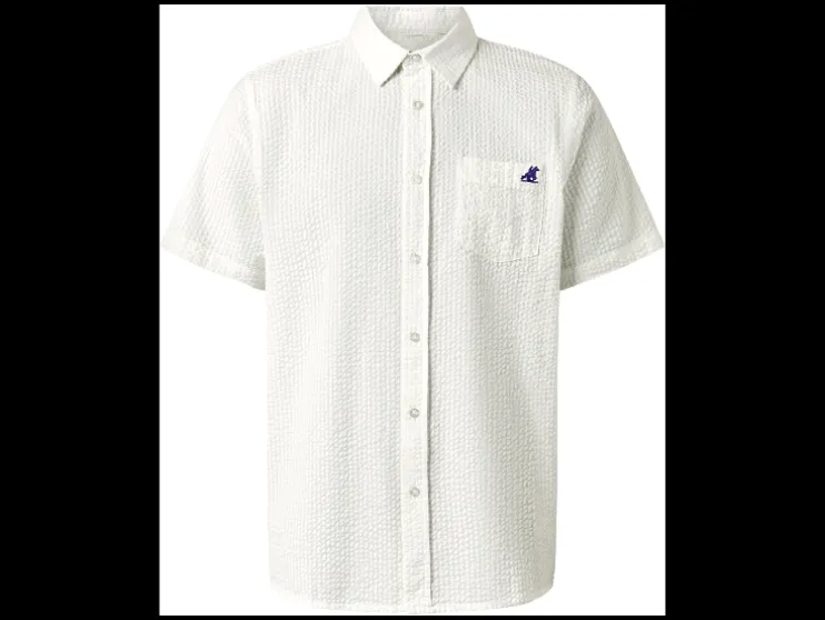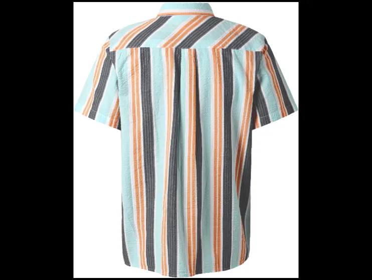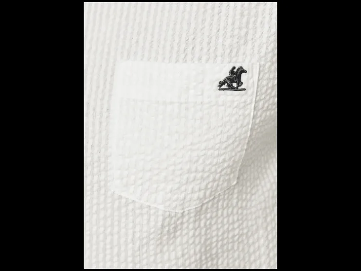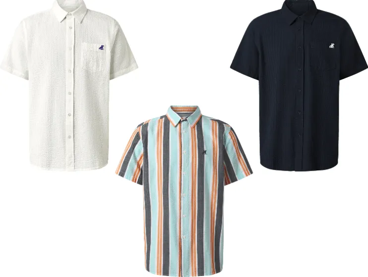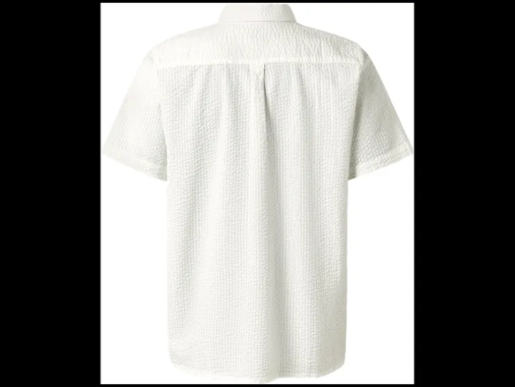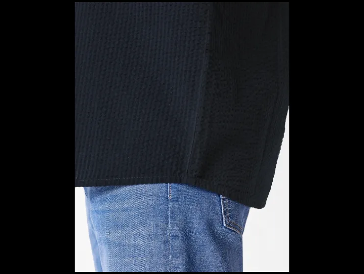 | Detail: | Seersuckerstructuur, doorlopende knoopsluiting, verlengde achterkant en afgeronde zoom |