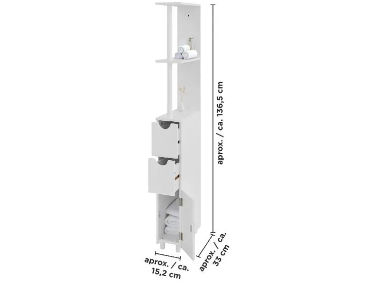 De LIVARNO hoge kast is een smal meubel met verrassend veel opbergruimte. Ideaal voor kleine ruimtes waar je toch overzicht wilt houden.