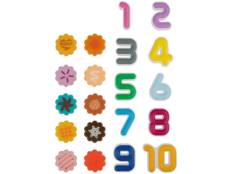 - Met 10 kleurrijke koekjes en 10 cijfers met passend gewicht