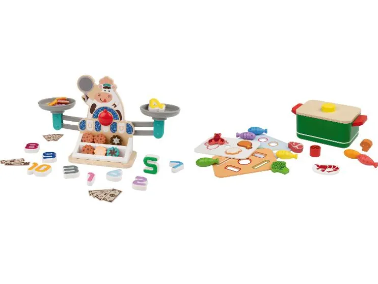 | Leveringsomvang: | Weegschaal: 1x weegschaal, 10x cijfers, 10x koekjes, 10x papiergeld Kookpot: 1x kookpot met deksel, 3x sorteerschijven, 14x ingrediënten |