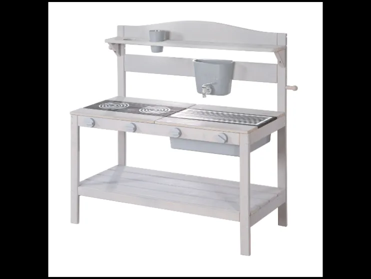 De roba buitenspeelkeuken is een stevige modderkeuken van massief hout, perfect voor kinderen vanaf 1,5 jaar. Deze speelkeuken in stijlvol grijs is speciaal ontworpen om de fantasie van je kind te prikkelen en zorgt voor urenlang speelplezier, zowel buiten als binnen.