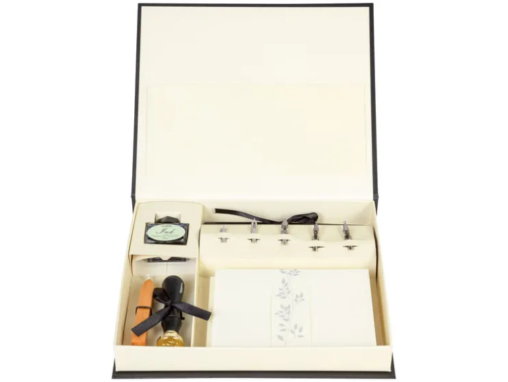 1 houten pen, 5 kalligrafie penpunten van hoge kwaliteit, 1 potje blauwe inkt, 1 zegelstempel met filigraan motief, 1 stang zegellak, 10 gevouwen kaarten met enveloppen, 1 stevige opbergdoos