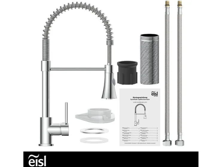 1 x wastafelarmatuur LEON,1 x vaatdouche met doucheslang voorgemonteerd, 1 x tegengewicht, 1 x snelmontageset incl. 2 x flexibele aansluitslang ca. 45 cm, montagebeschrijving