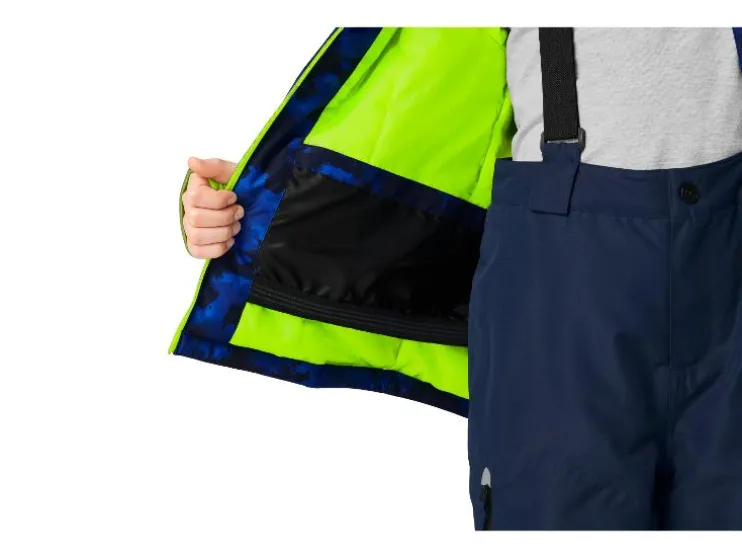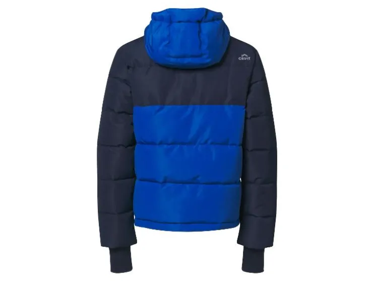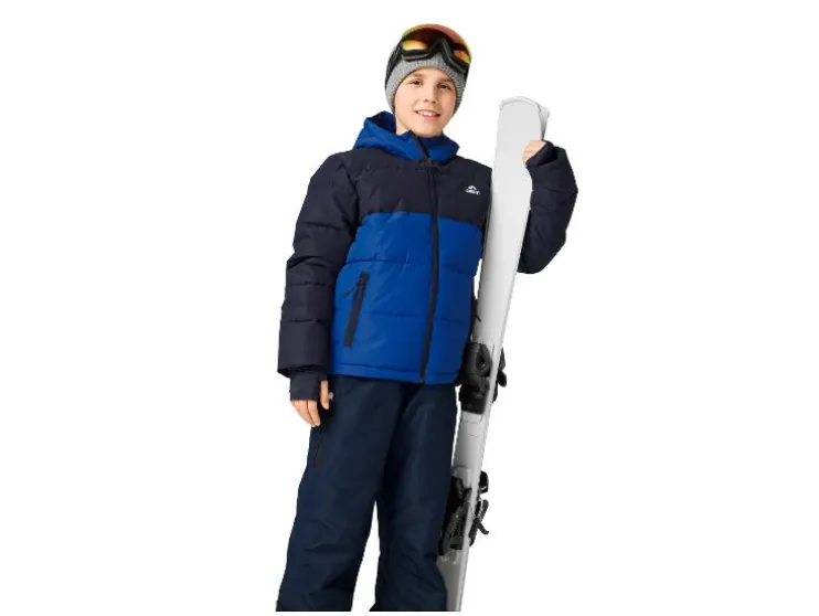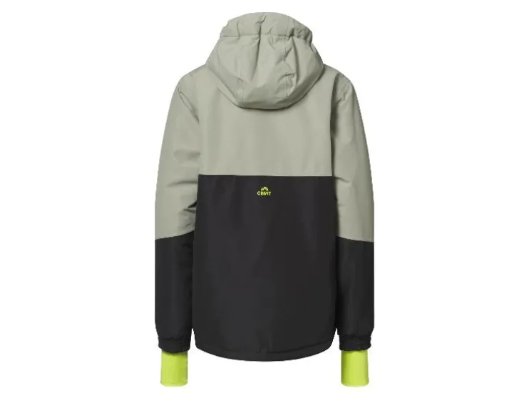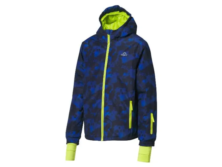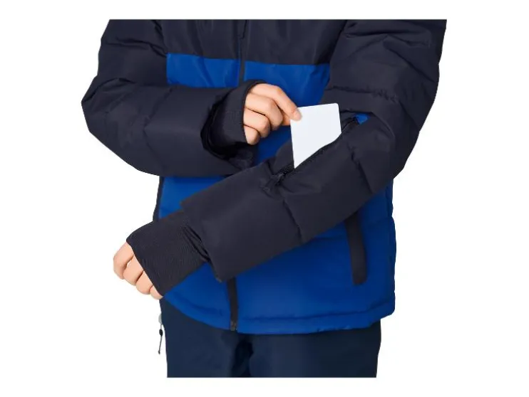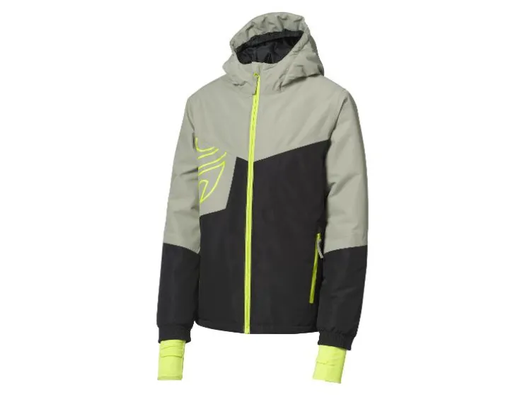- Met reflecterende elementen, een doorlopende rits met kinbescherming en skipasvak op de mouw