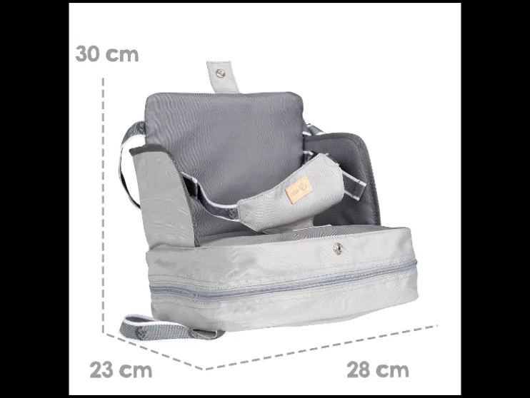 De zitverhoger voldoet aan de Europese veiligheidsnorm EN 16120. Alle gebruikte materialen zijn gecertificeerd en worden regelmatig gecontroleerd. Dankzij het compacte formaat (30 x 28 x 23 cm) neem je de zitverhoger makkelijk mee in de auto, tas of koffer.
