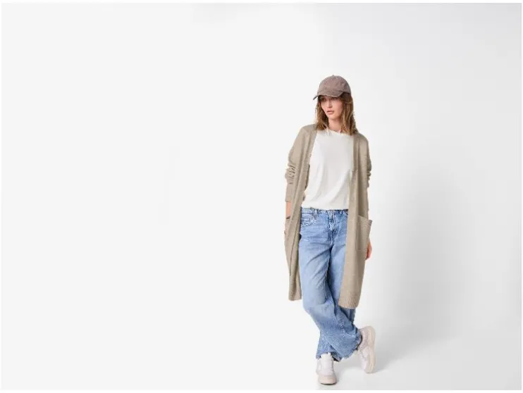 - Open, casual model met oversized schouders