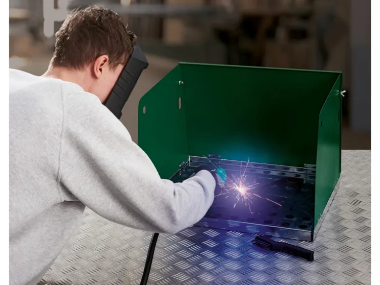 - Ter bescherming van de omgeving tegen spatten van materiaal, rondvliegende vonken en verblindend licht tijdens las- en slijpwerkzaamheden