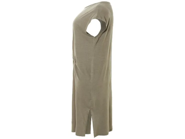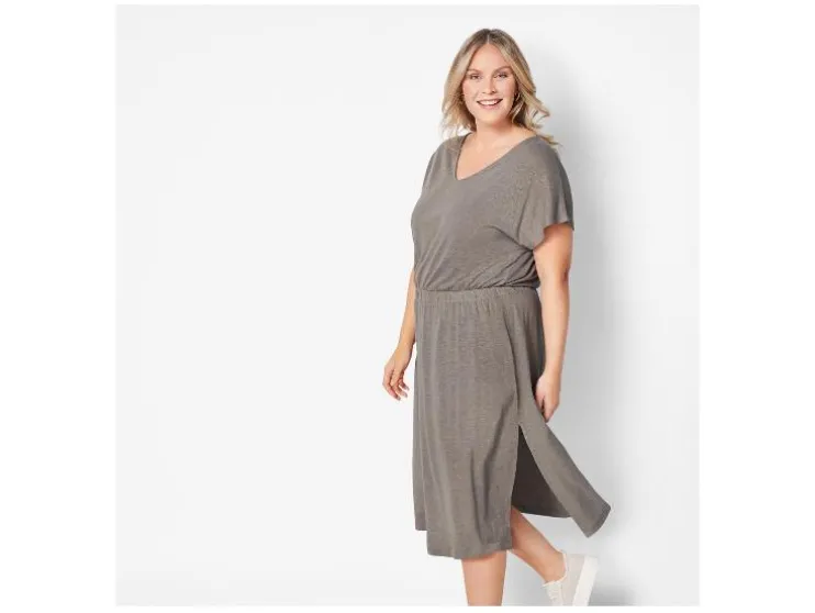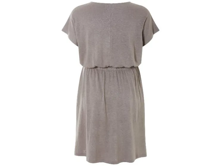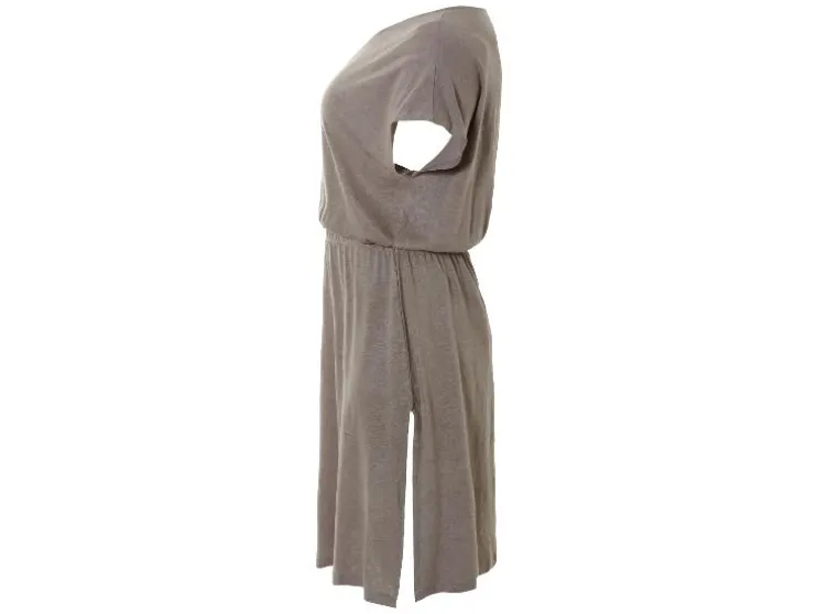 - Taupe: met V-hals, elastiek in de taille en zijsplitten