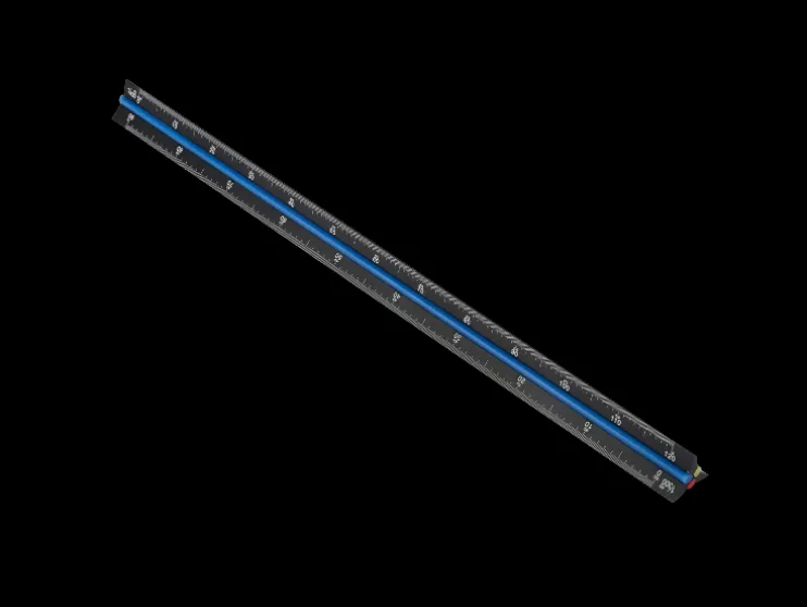 - 3-zijdig met 6 verschillende schalen: 1:100–1:200 (rood), 1:300–1:400 (blauw), 1:500–1:600 (geel)