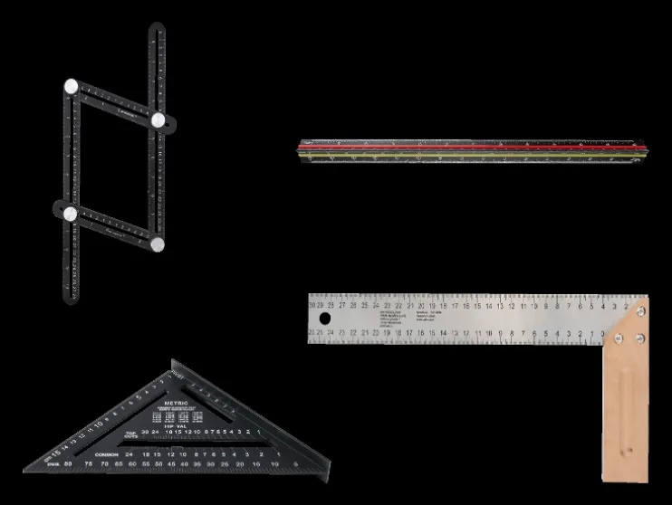 | Afmetingen: | Multihoek meetliniaal: lange liniaal ca. L 30,5 x B 2,5 cm, korte liniaal ca. L 17 x 2,5 cm Driehoekige liniaal: ca. L 32 x H 1,7 cm; Driehoekige liniaal met aanslaghoek: ca. L 18,3 x B 18,3 x H 2,2 cm; Winkelhaak: ca. L 30,5 x B 14,8 x H 1,2 cm |