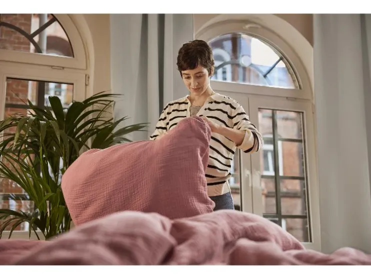 Slaap fris en comfortabel onder dit mousseline dekbedovertrek van 100% katoen. De stof is ademend, zacht en voelt prettig aan op je huid. Ideaal voor warme nachten of als je snel last hebt van warmte in bed.
