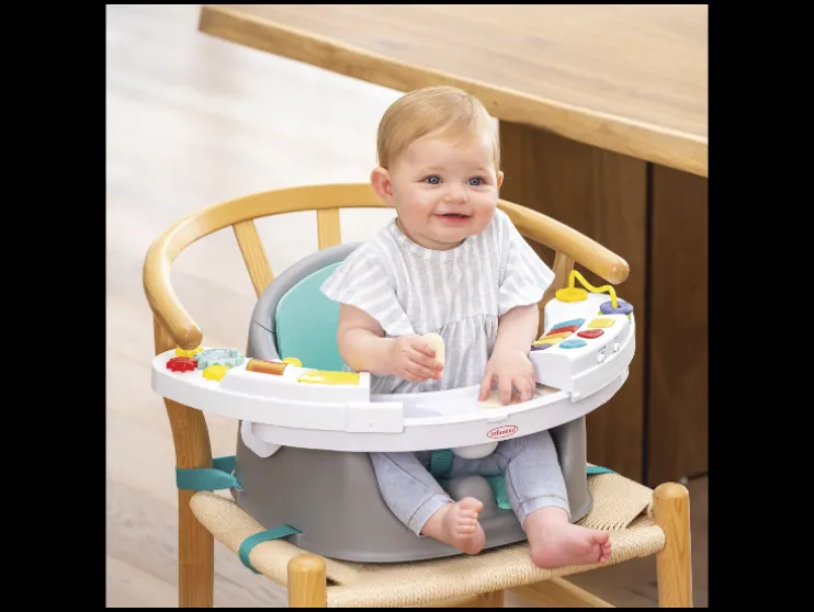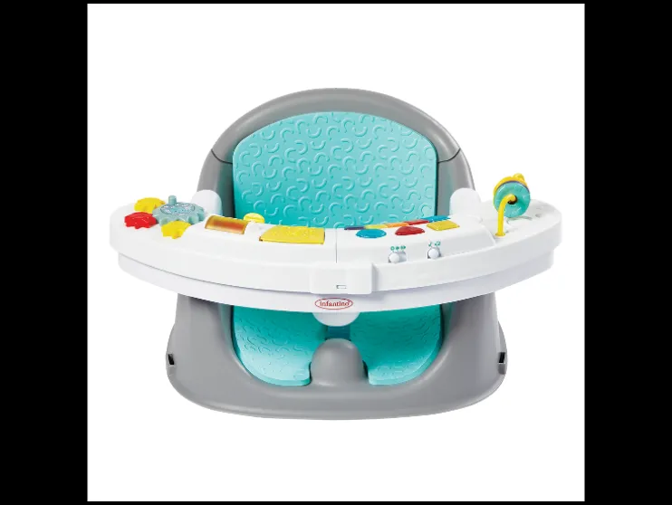 Het Infantino 3-in-1 Ontdekkingstoeltje is ontworpen om met je baby mee te groeien. Het product combineert een ontdekkingstoeltje, een positioneerder en een stoelverhoger in één. Baby’s ontdekken spelenderwijs hun omgeving met een knipperend klavier, een spiegelboekje, een kralenspel en vrolijke spiralen. Wanneer het speelgoed wordt verwijderd, ontstaat er een handig dienblad dat ideaal is voor snacks of maaltijden.