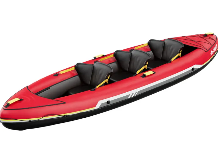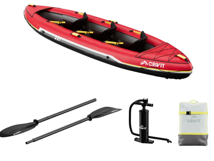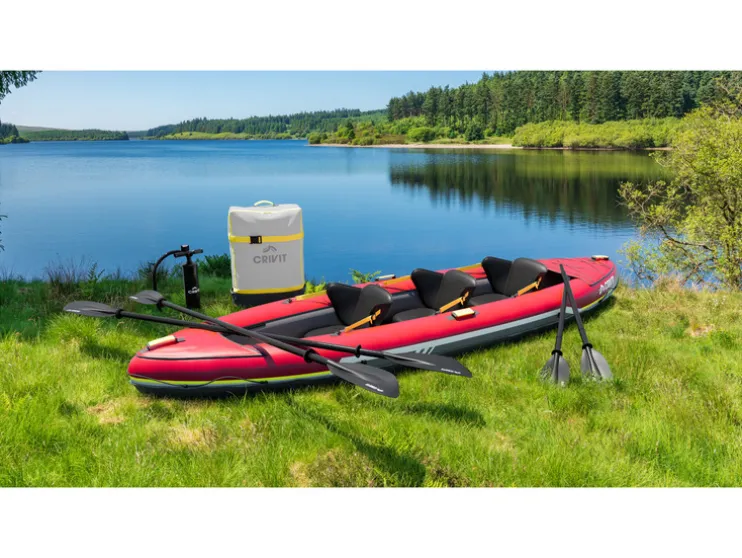 | Leveringsomvang: | Kajak, 2x dubbele peddels, dubbelslagpomp, rugzak, 2x vinnen, 3x kajakstoelen en reparatieset |