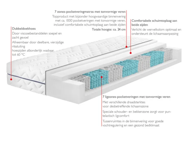 - Kernstructuur: ca. 13 cm hoge 7-zones pocketverenkern met ca. 1.000 veren (referentiemaat: 100×200 cm) en aan beide zijden ca. 4 cm hoge comfortschuimlagen