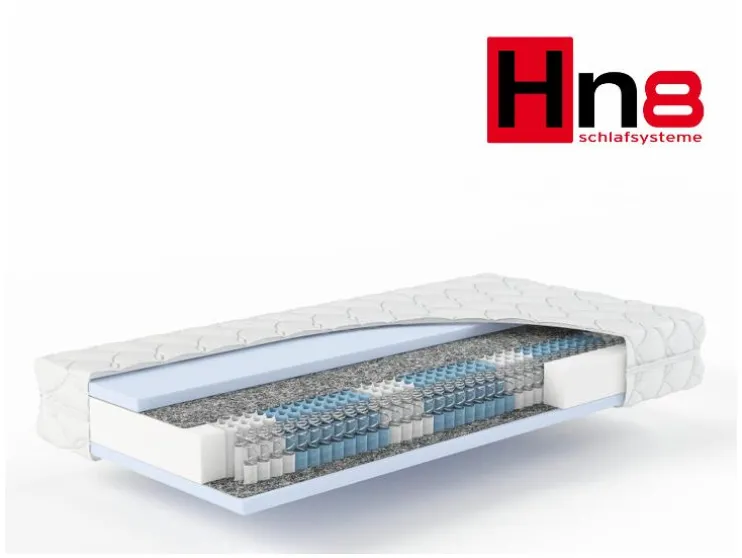 12 cm hoge 7-zone pocketveren kern met 1.000 veren op 100×200 cm en aan beide zijden Hyperflex-comfortschuim voor aan het lichaam aangepast slaapcomfort en dubbele stoffen hoes met SilverSpirit-afwerking. De totale hoogte is ca. 22 cm.