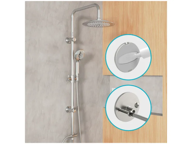 Geniet van een ontspannen douche-ervaring met deze grote regendouchekop van Ø 24 cm. De doucheset biedt een echte wellnessbeleving dankzij de brede straal en de verstelbare handdouche met drie standen. Je kunt kiezen of je de doucheset wilt plakken of boren, afhankelijk van je badkamerwand. De anti-kalkknoppen maken schoonmaken eenvoudig, en de verstelbare wandhouder is ideaal bij renovaties.