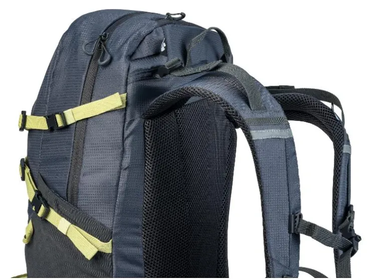 - Zijdelingse meshvakken en lussen voor bevestiging van bijvoorbeeld slaapzak, slaapmat, wandelstokken etc.