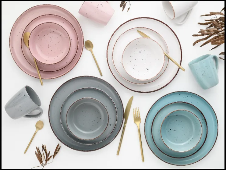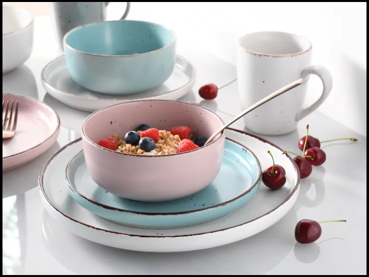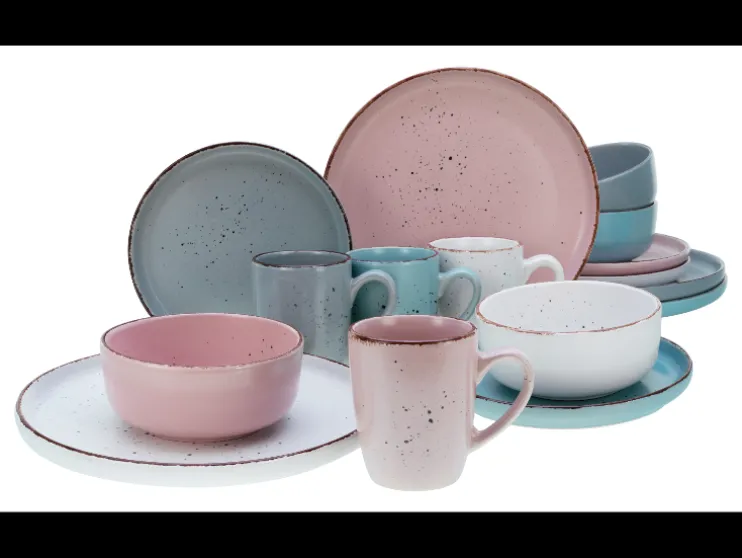 - Zijdematte glazuur met fijne spikkels in tinten als turquoise, mintgroen, steen- en crèmewit