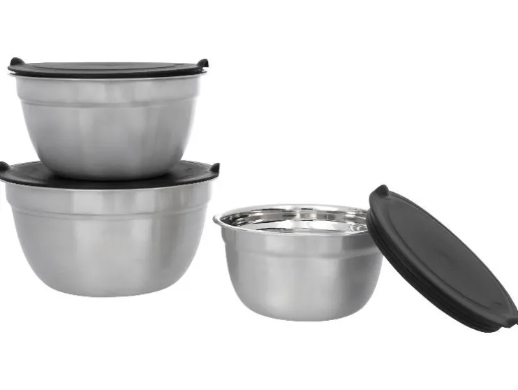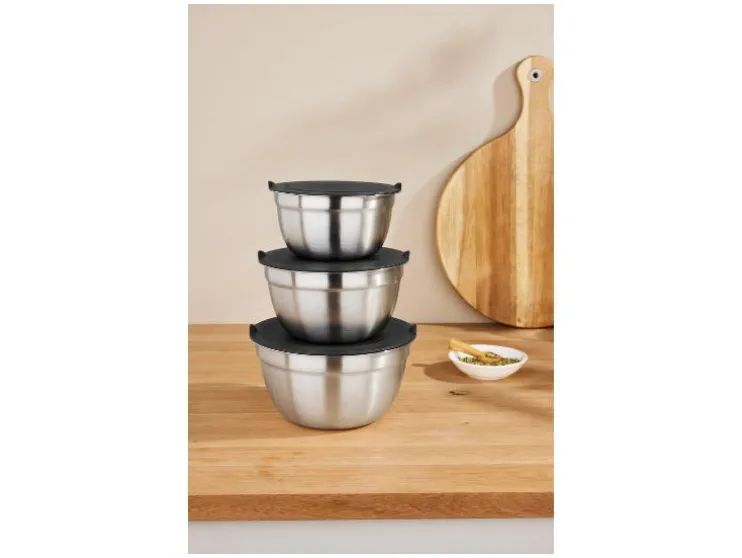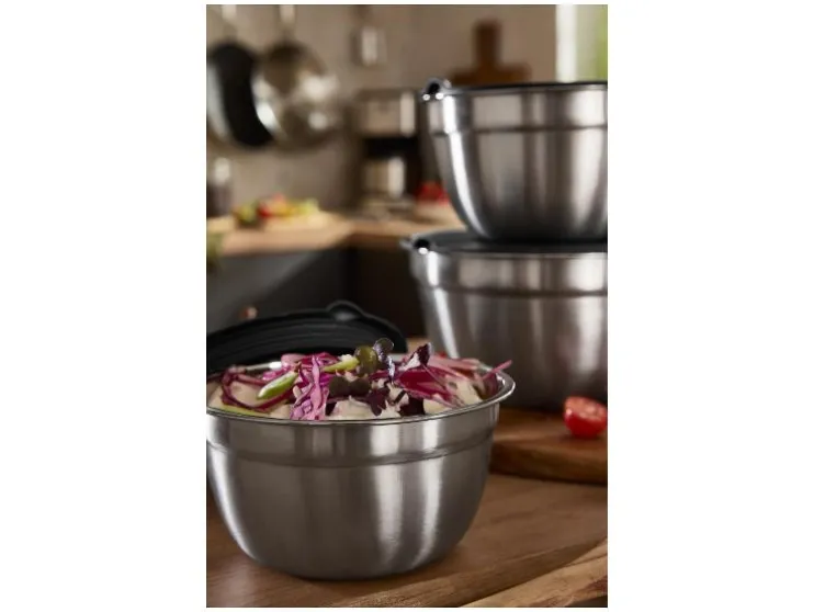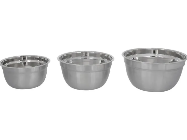 Deze set van drie RVS schalen is ideaal voor bereiden, serveren en bewaren. Praktisch, stapelbaar en klaar voor dagelijks gebruik.