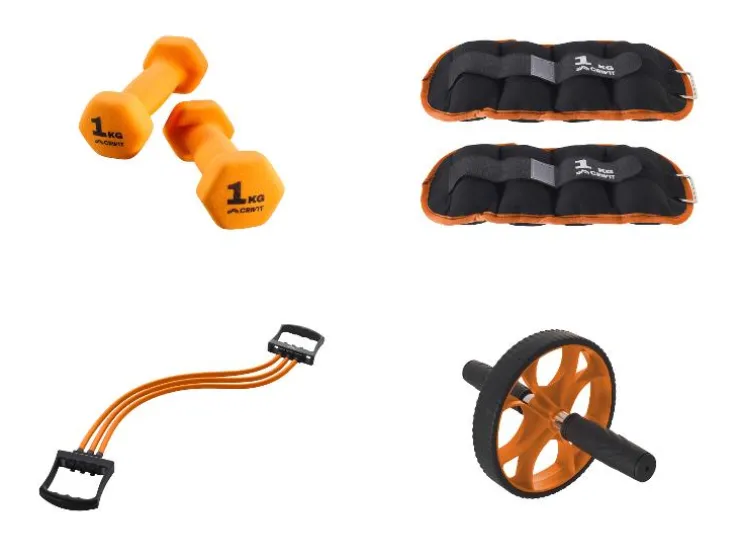 | Materiaal: | Halters, 2x 1 kg: kunststof, ijzer Gewichtsmanchetten, 2x 1 kg: nylon, jersey, ijzer, staal Expander: kunststof Buikspierwiel: kunststof, staal |