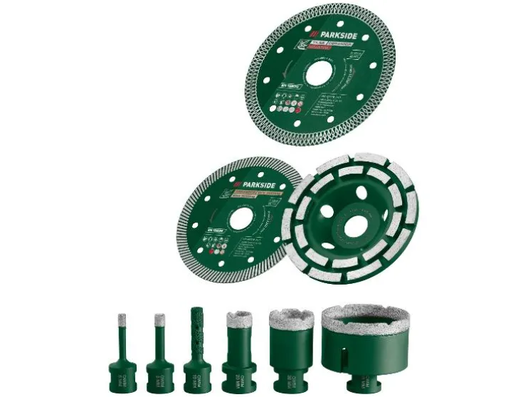 | Inhoud: | 1x diamant slijpkom, 1x turbo-diamantslijpschijf, 1x turbo-diamantslijpschijf met kruissegmentpatroon, 1 slijpvinger en 5 diamantboorkronen |